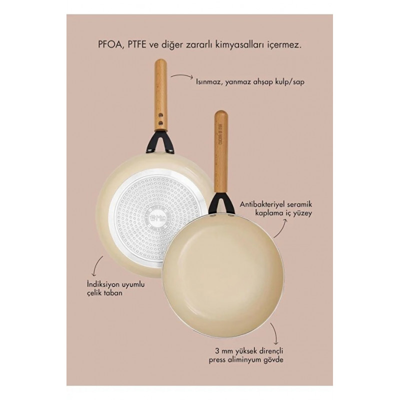 Cucina Di Mia Semarik TavaÜrün ölçüsü: 26 cmKalınlık 3 mmSeramik yüzey, PTFE, PFOA, PFAS içermediği için zararlı kimyasallar barındırmaz.; İndüksiyon elektrikli, radyan cam ve gaz ocakların tamamında kullanılabilir.; Kulplarındaki ısı yalıtkanlığı ısınmazlık ve yanmazlık özelliğine sahiptir, el ile rahatlıkla tutabilirsiniz.; Doğal yapışmaz yüzey size yağsız veya az yağ ile yemek pişirme imkânı sunar.; Seramik kaplaması sayesinde ısıyı eşit şekilde dağıtarak yemeklerin dengeli pişmesini sağlar.; Kolay temizlenir, elde veya bulaşık makinesinde yıkanabilir (ancak elde yıkama ömrünü uzatır).; Seramik Kaplama Tencere ve TavalarSağlıklı pişirme yöntemlerine olan ilgi ve yapışmaz yüzey arayışı nedeniyle en çok güvenilen ve kullanılan malzeme olmuştur.; Geleneksel yapışmaz yüzeylere göre daha doğal bir alternatif sunan bu tencere ve tavalar, sunduğu pek çok avantajla öne çıkıyor.; Seramik kaplama tencere ve tavalar, mutfakta hem sağlıklı hem de yapışmazlık ve homojen ısı dağılımı arayanlar için harika bir seçenektir.; Doğru kullanım ve bakımla uzun yıllar mutfağınıza eşlik edebilirler.; Seramik Kaplama Nedir?Seramik kaplama, silika (kum) bazlı, sentetik olmayan bir malzemedir.; Bu kaplama, genellikle alüminyum gövdeli tencere ve tavaların dış yüzeyine uygulanarak yapışmaz ve sağlıklı bir özellik kazandırır.; Üretim aşamasında yüksek sıcaklıklarda pişirilen seramik kaplama, tencere ve tavalara dayanıklı ve pürüzsüz bir yüzey sağlar.; Avantajları Nelerdir?Seramik kaplama tavaların en bilinen ve tercih edilen özelliği, yağsız veya az yağlı pişirme imkanı sunmasıdır.; Bu sayede daha hafif ve sağlıklı yemekler hazırlamak mümkün hale gelir.; Ayrıca:• Doğal Malzemeler: Genellikle PTFE (Teflon), PFOA, PFAS gibi kimyasal maddeler içermediği için sağlıklıdır, kanserojen madde içermez ve doğa dostudur.; • Hızlı ve Eşit Isınma: Seramik kaplama, tavanın hızlı bir şekilde ısınmasını ve ısının eşit dağılmasını sağlar.; Bu da yemeklerinizi daha dengeli pişirmenize yarar.; • Yapışmaz Yüzey : Seramik kaplama yapışmaz bir yüzeye sahip olduğu için yağsız veya az yağlı yemek pişirme imkanı sunar.; • Kolay Temizlik: Yapışmaz yüzeyi sayesinde yemek kalıntılarının temizlenmesi oldukça kolaydır.; Çoğu zaman sadece sıcak su ve nazik bir deterjanla yıkanması yeterlidir.; • Çizilme Direnci: Kaliteli seramik kaplamalar, metal mutfak gereçlerine karşı belirli bir oranda çizilme direnci gösterir ancak yine de tahta veya silikon spatulalar kullanmak, kaplamanın ömrünü uzatacaktır.; • Estetik Görünüm: Farklı renk ve tasarımlarda üretilebilen seramik tavalar, mutfaklara şık bir görünüm katar.; Dikkat Edilmesi GerekenlerSeramik kaplama tavaların performansını ve ömrünü korumak için bazı noktalara dikkat etmek önemlidir:• İlk Kullanım: Tencere ve tavanızı ilk kez kullanmadan önce, hafifçe yağlamak ve temizlemek önerilir.; • Temizlik: Bulaşık makinesinde yıkanabilen modeller olsa da, elde yıkamak kaplamanın zarar görmesini engeller.; Bulaşık makinesinde kullanılan aşındırıcı temizlik malzemelerinin kullanılmaması önerilir• Mutfak Gereçleri: Metal gereçler yerine tahta, plastik veya silikon spatulalar tercih edilmelidir.
